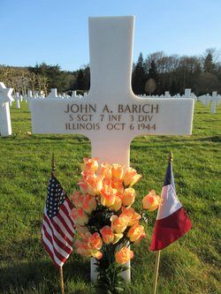 S/Sgt John A. Barich was killed by small arms fire to the thorax.Source of information: Leo Minne, www.abmc.gov, www.wwiimemorial.com, www.ancestry.com - 1930/1940 Census / Headstone and Interment Record / U.S.Draft Cards Young Men / U.S. Hospital Admission Card, History 3rd Infantry Division