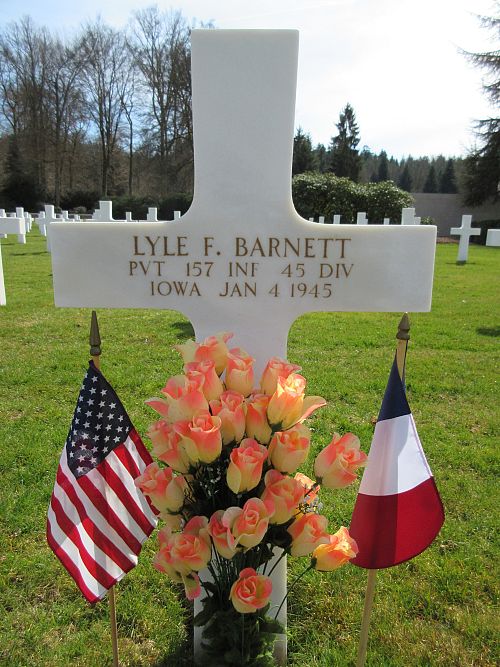 Pvt Lyle F. Barnett was a driver before he enlisted in Camp Dodge Herrold, Iowa on 19 April 1944.Source of information: Peter Schouteten, www.abmc.gov, www.wwiimemorial.com, www.archives.gov – WWII Enlistment Record, www.ancestry.com - Headstone and Interment Record / Iowa World War II Bonus Case Files / Fairbanks Talley Family Tree / 1940 Census, http://www.45thdivision.org, www.findagrave.com