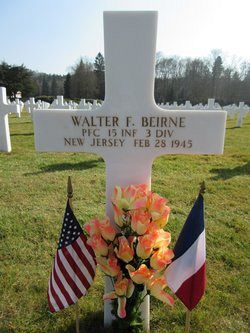 Pfc Walter F. Beirne was employed by the Pollak Manufacturing Company before he volunteered for the Army of the United States in Newark, New Jersey on 24 January 1942.He died of wounds caused by artillery shell fragments in the thorax near his heart. The exact date when he was reported wounded in action and the location where he died are not known.