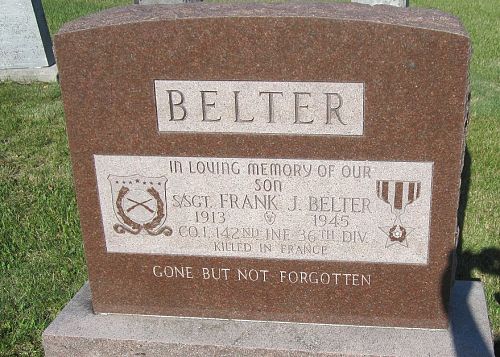 S/Sgt Frank J. Belter was married to Lela Kagel on 6 April 1940.He was awarded the Silver Star Medal posthumously. The citation cited: For conspicuous gallantry and intrepidity in action while serving with Company I, 142nd Infantry Regiment, 36th Infantry Division, in action on 11 February 1945 in France. While attacking well-fortified houses in an enemy held town, S/Sgt Belter volunteered to lead his squad across open, fire-swept terrain into a group of houses where they could deliver fire on the enemy's rear. Fully aware of the danger involved he started to advance across the open space. While running towards his objective S/Sgt Belter was killed by machine-gun fire. His heroic action inspired his comrades to renewed aggressiveness against the hostile force.