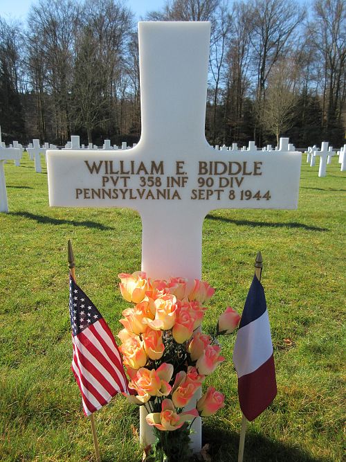 Pvt William E. Biddle attended high school for 1 year and was a mechanic and repairman before he enlisted in Philadelphia, Pennsylvania on 22 March 1943.He was first buried at the Temporary American Military Cemetery in Champigneul, France.