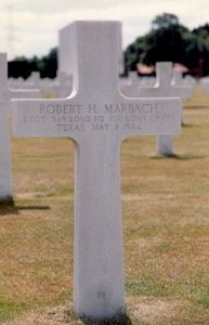 S/Sgt Robert H. Marbach attended San Antonio Vocational and Technical High School.The oxygen system was knocked out just as bombs were released. The only alternative was to descend to 15,000 or below to survive. The airplane was on top and they intended to stay in the clouds on the way back. After about 20 minutes they ran out of cloud cover and were immediately attacked by a flock of ME-109's. They were pretty well shot up - out of ammunition and on fire in the right wing. The control column went limp after a hit in the tail section with no control there was nothing they could do except bail out. Two crew members were killed, eight were taken prisoner.