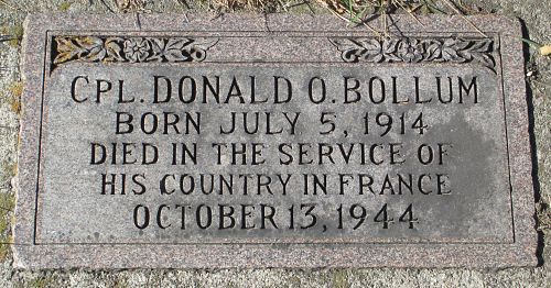 T/5 Donald O. Bollum was employed on a farm before he enlisted on 2 March 1942. He was sent overseas on May 1944.He is remembered at the Farwell Cemetery in Farwell, Pope County, Minnesota.