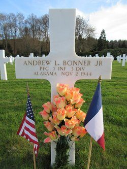 Pfc Andrew L. Bonner Jr. worked on the family farm before he enlisted at Fort McClellan, Alabama on 6 May 1943. He was sent overseas in June 1944.He was killed by artillery shell fragments in the back and thorax.