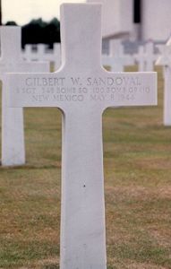 S/Sgt Gilbert W. Sandoval volunteered for the Air Corps of the Army of the United States in Santa Fe, New Mexico on 9 December 1942.The oxygen system was knocked out just as bombs were released. The only alternative was to descend to 15,000 or below to survive. The airplane was on top and they intended to stay in the clouds on the way back. After about 20 minutes they ran out of cloud cover and were immediately attacked by a flock of ME-109's. They were pretty well shot up - out of ammunition and on fire in the right wing. The control column went limp after a hit in the tail section with no control there was nothing they could do except bail out. Two crew members were killed, eight were taken prisoner.