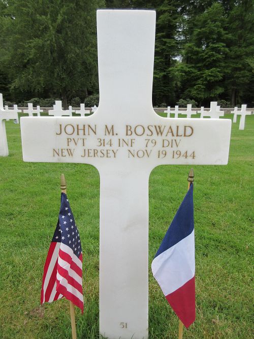 Pvt John M. Boswald attended college for one year and was employed at the Frank Graham Paper Company before he enlisted at Fort Dix, New Jersey on 1 March 1944.He was killed by small arms fire to his tibia.