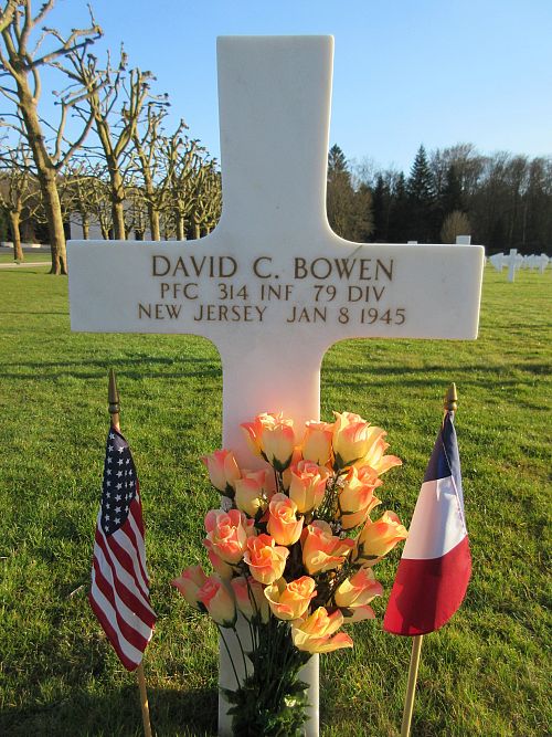 Pfc David C. Bowen attended college for one year and was a powder chemist before he joined the U.S. Army Reserve at Fort Dix , New Jersey on 12 January 1944.He was killed by artillery shell fargments to his chest.
