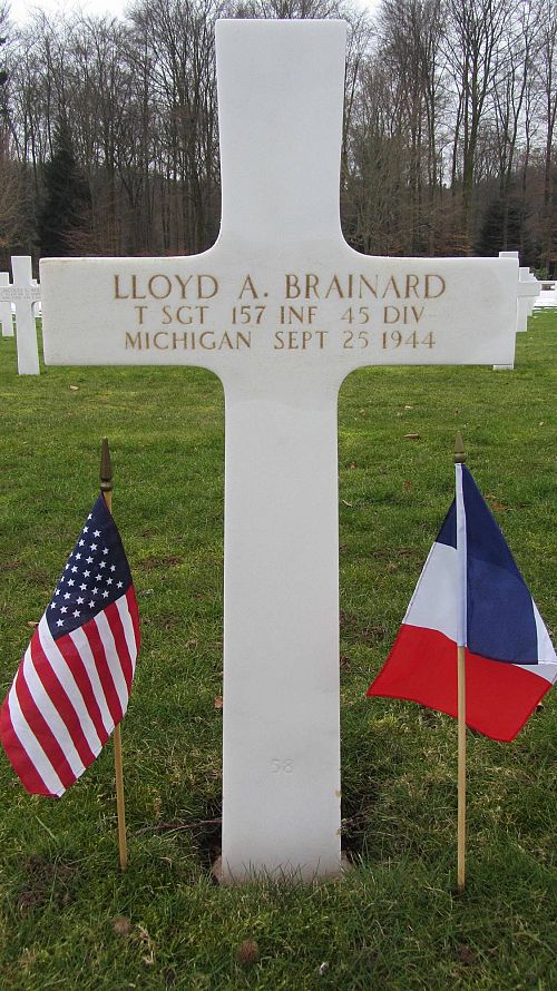 T/Sgt Lloyd A. Brainard attended high school for 1 year before he joined the National Guard in Owosso, Michigan on 15 October 1940.He was first buried at the Temporary American Military Cemetery in Saint-Juan, France.