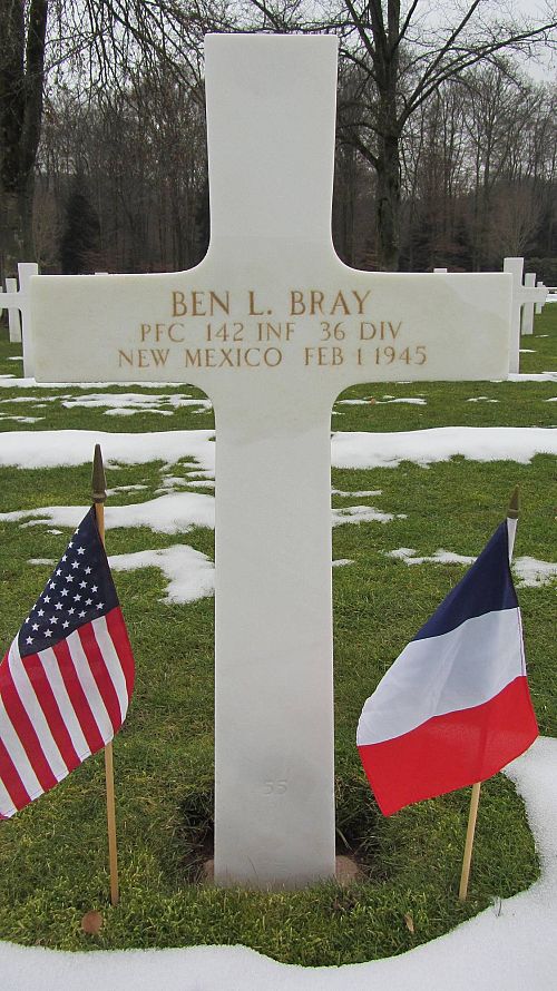 Pfc Ben L. Bray enlisted at Fort Bliss, Texas on 5 June 1944.Source of information: André Koch, www.abmc.gov, www.wwiimemorial.com, www.archives.gov - WWII Enlistment Record, www.ancestry.com - Headstone and Interment Record / U.S. WWII Draft Cards Young Men 1940-1947 / 1910/1920/1940 Census, 142ndaar-.pdf, https://36-id.frb.io