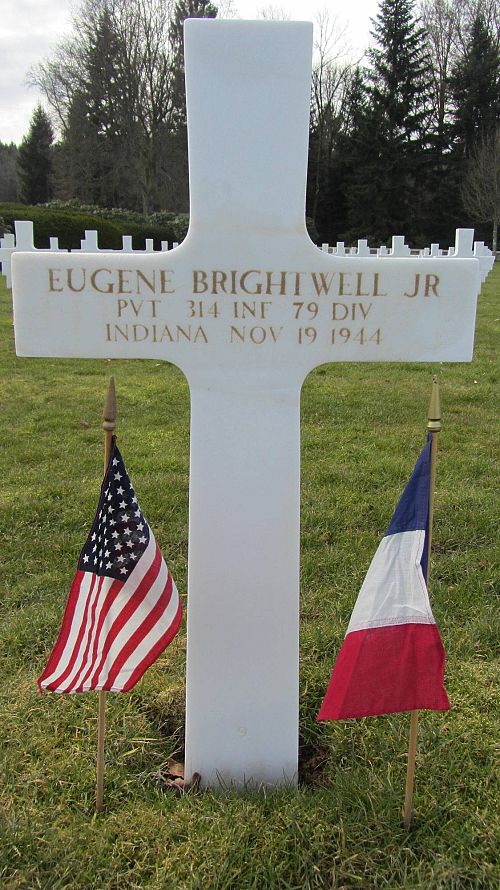 Pvt Eugene Brightwell Jr. attended high school for one year and was employed at the Tanell Construction Company before he enlisted in Louisville, Kentucky on 21 July 1943. He was overseas for just one month when he was killed.He was killed by artillery shell fragments to his buttock and hip.