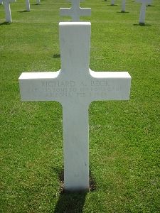 2nd Lt Richard A. Beck graduated from Tucson High School and was a student atSan Bernardino Junior College in California when he joined the Air Corps of the U.S. Army Reserve in Los Angeles, California on 10 September 1942.The airplane was hit by flak on the right wing, reported to have been a ground rocket, just after bombs away. Starboard engines began to flame and the plane was nosed over in a steep dive apparently in an effort to extinguish the fire. A few seconds later, it pulled up in a half roll, then did a split S and went down. Two parachutes were seen as it fell away in a tight spin. When last seen the plane was nearly enveloped in fire.