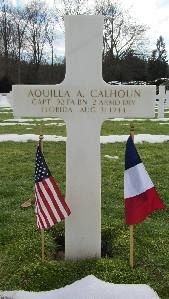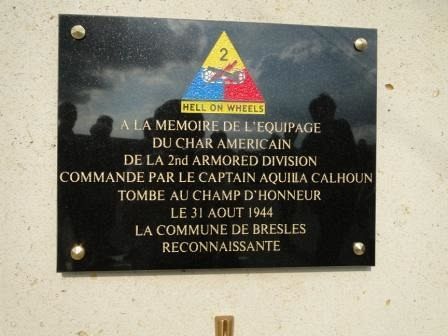 A memorial was erected in the town of Bresles. It states: "In memory of the tank crew of the 2nd Armored Division commanded by Captain Aquila Calhoun, who fell on the field of honor on 31 August 1944. The town of Bresles remembers."