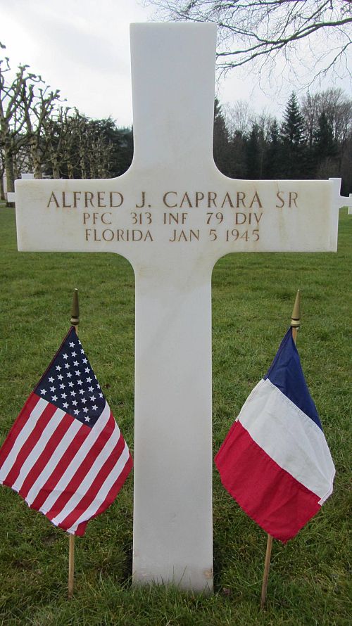 Pfc Alfred J. Caprara Sr. worked at the Naval Air Station before he enlisted at Fort McPherson, Georgia on 22 March 1944. He was sent overseas in September 1944.Source of information: Peter Schouteten, www.abmc.gov, www.wwiimemorial.com, www.archives.gov - WWII Enlistment Record, www.ancestry.com - Headstone and Interment Record / U.S. WWII Draft Cards Young Men, Combat History 79th Infantry Division, www.findagrave.com - Russ Pickett, www.newspapers.com - Pensacola News Journal 15 February 1945