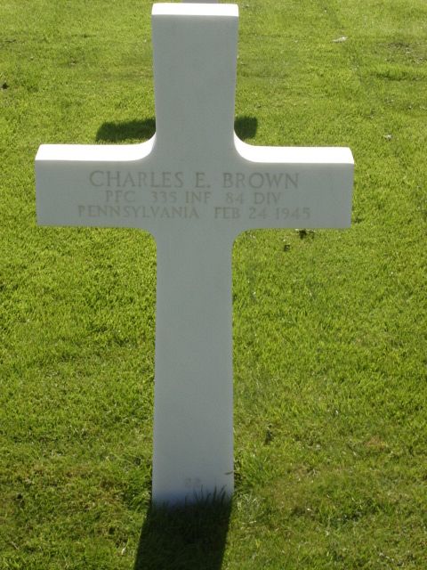 Charles E. Brown enlisted on 23 July 1942 in Bellevue, Pennsylvania.According to a letter of his division commander, Major General Alexander R. Bolling to his mother, dated 7 March 1945, Pfc Brown was killed by shrapnel during an attack in the vicinity of Doveren and Hetzerath, Germany.