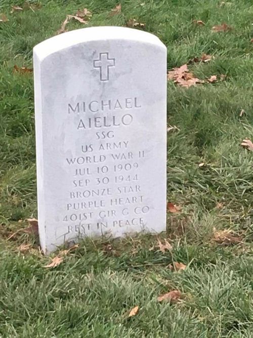 S/Sgt Michael Aiello volunteered for the U.S. Army in Peoria, Illinois on 24 March 1942. He was a miner before he joined the army.In May 2016, the Defense POW/MIA Accounting Agency exhumed the remains of an Unknown Soldier buried in Plot A Row 40 Grave 45 at Ardennes American Cemetery with the belief that an identification could be made. Research and analysis were used to positively identify the remains as belonging to S/Sgt Michael Aiello, who was listed Missing in Action since 30 September 1944.