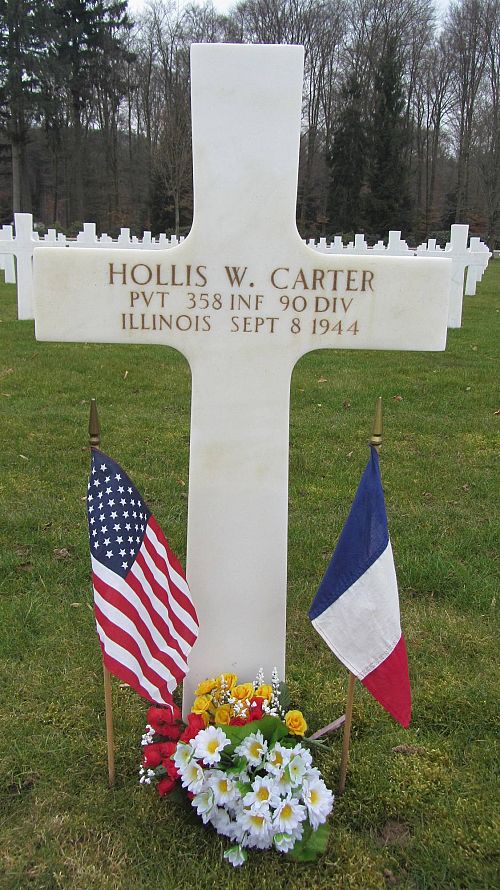 Pvt Hollis W. Carter was first buried at the Temporary American Military Cemetery in Champigneul, France.Source of information: Peter Schouteten, Terry Hirsch, www.abmc.gov, www.wwiimemorial.com, www.ancestry.com - Headstone and Interment Record