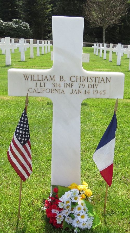 1st Lt William B. Christian graduated from the University of California at Los Angeles (UCLA) before he enlisted.Source of information: Peter Schouteten, www.abmc.gov, www.wwiimemorial.com, www.ancestry.com - Headstone and Interment Record / U.S. WWII Draft Cards Young Men / Dorothy Fach Family Tree, Combat History 79th Infantry Division, www.findagrave.com - MAJ Jimmy Cotton
