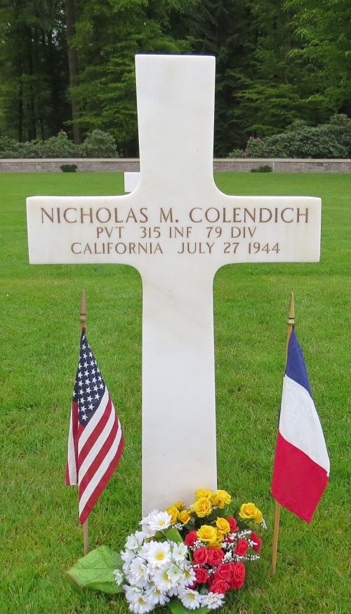 Pvt Nicholas M. Colendich was a manager and official before he enlisted in San Francisco, California on 30 October 1943. He was sent overseas in May 1944.He was first buried at the Temporary American Military Cemetery in Solers, France.