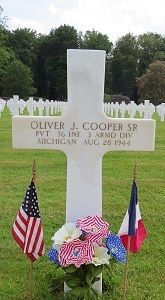 Pvt Oliver J. Cooper Sr. was first buried at Temporary American Military Cemetery Solers, France.Source of information: Peter Schouteten, Terry Hirsch, www.abmc.gov, www.wwiimemorial.com, www.ancestry.com - Headstone and Interment Record / Michigan Death Records / 1940 Census / Martin Bowers Family Tree, WWII Draft Card