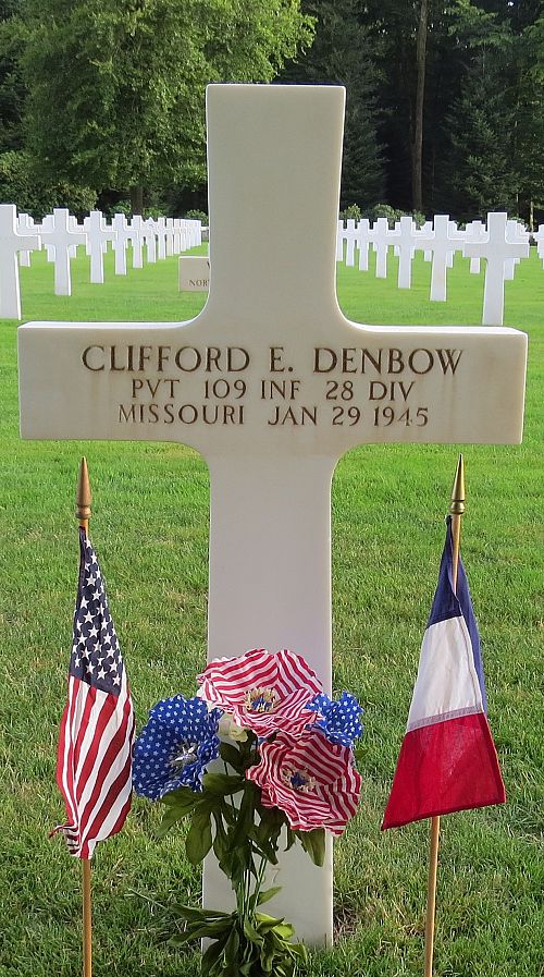 Pvt Clifford E. Denbow worked on a farm before he enlisted at Jefferson Barracks, Missouri on 26 July 1944.Source of information: Peter Schouteten, www.abmc.gov, www.wwiimemorial.com, www.archives.gov - WWII Enlistment Record, www.ancestry.com - Headstone and Interment Record / Lya Egan Family Tree / U.S. WWII Draft Cards Young Men / Arkansas County Marriages Index, www.findagrave.com, www.newspapers.com - Sikeston Standard Missouri 20 April 1945