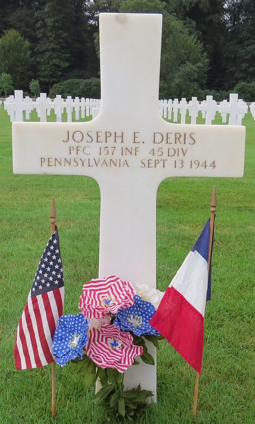 Pfc Joseph E. Deris attended high school for one year and was a waiter before he enlisted at Fort Dix, New Jersey on 5 February 1942.He was first buried at the Temporary American Military Cemetery in Saint-Juan, France.