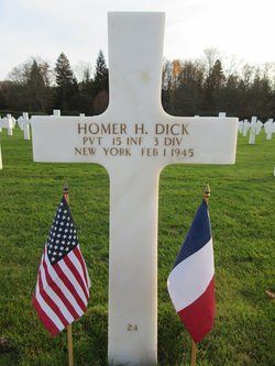 Pvt Homer H. Dick was a production worker before he enlisted in Buffalo, New York on 25 July 1945.He was killed by artillery shell fragments in the abdomen, pelvis and back.