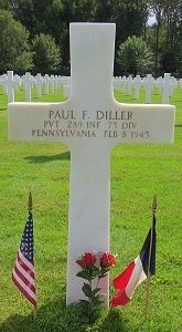 Pvt Paul F. Diller enlisted in Pittsburgh, Pennsylvania on 24 July 1944.Source of information: Peter Schouteten, www.abmc.gov, www.wwiimemorial.com, www.archives.gov – WWII Enlistment Record, www.ancestry.com - Headstone and Interment Record / Pennsylvania, Veteran Compensation Application Files, WWII / 1930 Census / Peterson Family Tree, http://75thdivisiondad.com