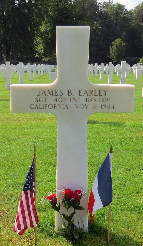 Sgt James B. Earley was a painter in construction and maintenance. He enlisted in Los Angeles, California on 15 March 1943.He was awarded the Bronze Star Medal. The citation reads as follows: "Sgt James B. Earley, 39288861, Infantry, Company "G", 409th Infantry Regiment. For heroism in action. On 16 November 1944, in the vicinity of Saint-Die, France, when his squad was pinned down by enemy fire, Sgt Earley managed to crawl clear of the enemy fire and contact elements of his company to bring relief to his squad. Returning close to the enemy positions, he threw hand grenades into their emplacements until he was fatally wounded by an enemy grenade. As a result of his heroic actions five of the enemy were taken prisoner and four were killed. Sgt Earley's actions reflected the highest traditions of the military service."