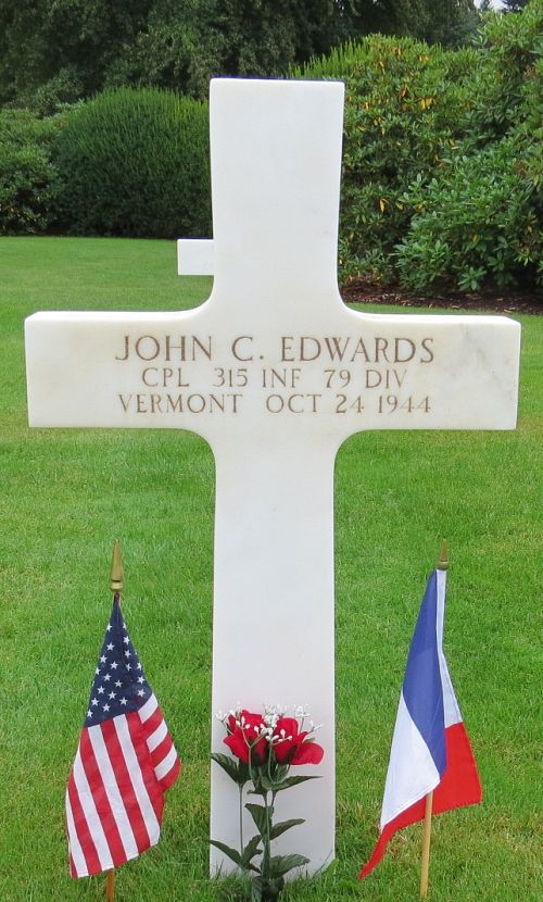 Cpl John C. Edwards attended high school for two years and was a steward in the Graduate Club before he enlisted in Rutland, Vermont on 24 October 1942.He was killed by artillery shell fragments.