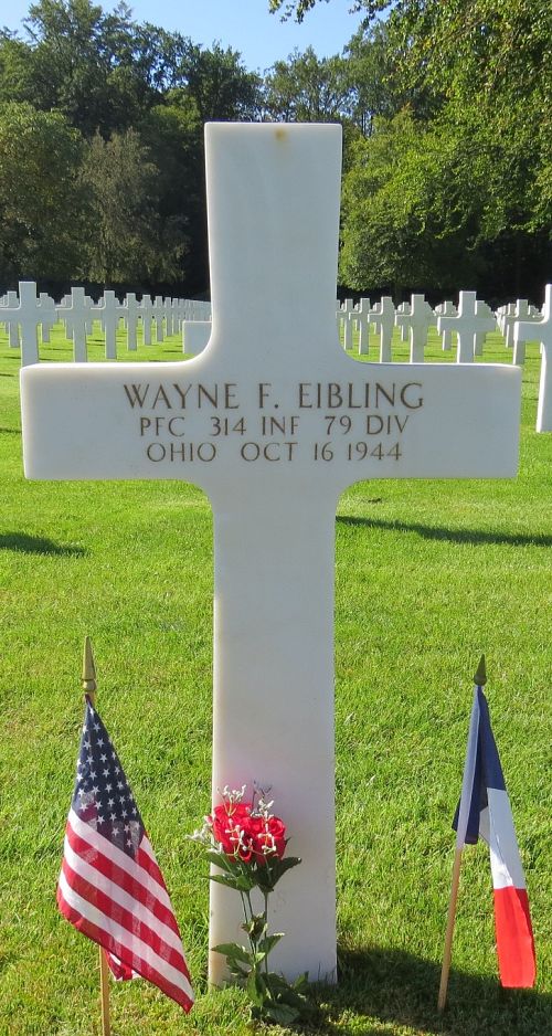 Pfc Wayne F. Eibling attended high school for four years and was employed at the Beith M Goodings Grocery before he enlisted at Fort Benjamin Harrison, Indiana on 4 June 1942. He was sent overseas in April 1944.He was killed by artillery shell fragments.