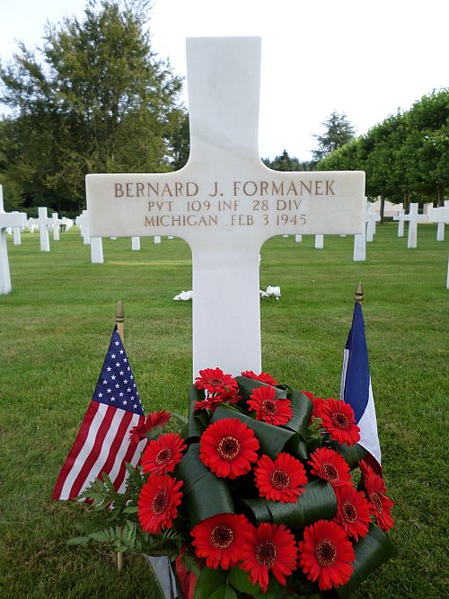 Pvt Bernard J. Formanek attended high school for one year and was employed by the Ford Motor Car Company before he enlisted in March 1943.Source of information: Peter Schouteten, www.abmc.gov, www.wwiimemorial.com, www.ancestry.com - Headstone and Interment Record / Formanek Family Tree / U.S. WWII Draft Cards Young Men, www.findagrave.com – Jon Saunders