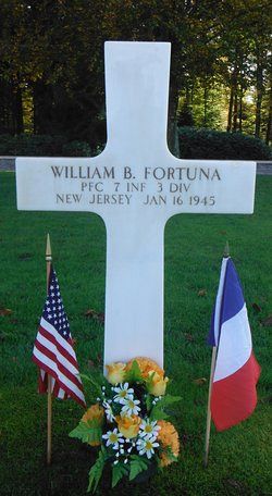 Pfc William B. Fortuna was a farmhand before he enlisted in Newark, New Jersey on 22 November 1943.He was killed in action by artillery shell fragments in the abdomen and leg.