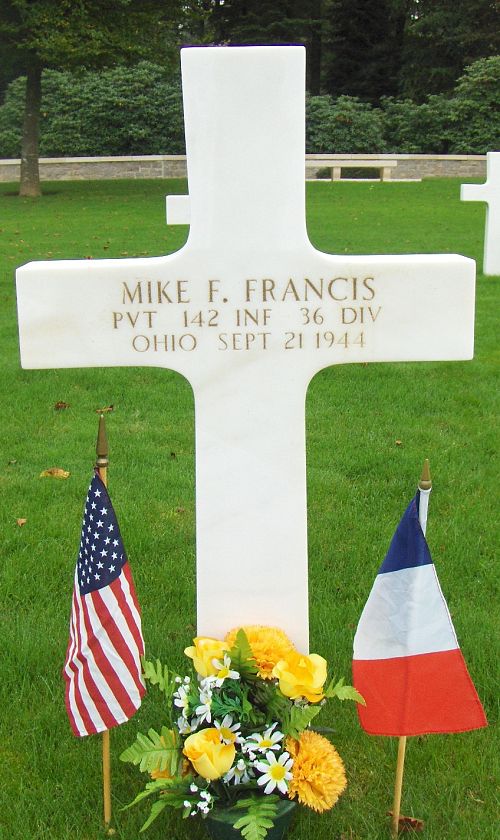 Pvt Mike F. Francis enlisted in Cleveland, Ohio on 22 November 1943.Source of information: André Koch, www.abmc.gov, www.wwiimemorial.com, www.archives.gov - WWII Enlistment Record, www.ancestry.com - Headstone and Interment Record / 1920/1930/1940 Census / U.S. WWII Draft Cards Young Men 1940-1947 / 142ndaar-.pdf, https://36th-id.frb.io
