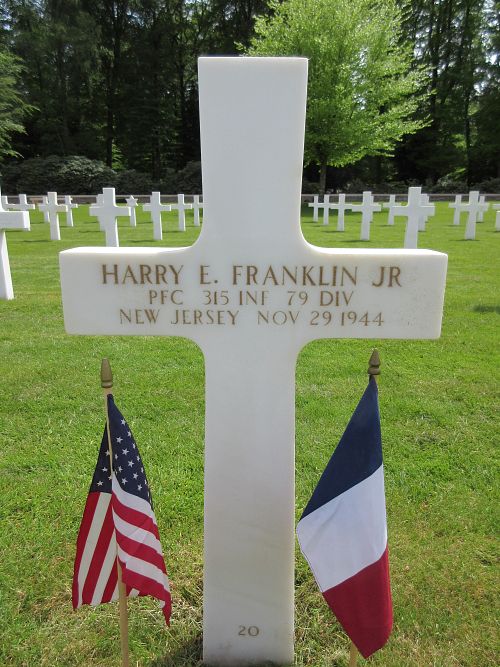 Pfc Harry E. Franklin Jr. attended high school for one year and was employed at the A. K. De Lemos Music Company before he enlisted in Newark, New Jersey on 28 November 1940.He was killed by artillery shell fragments in his neck and face.