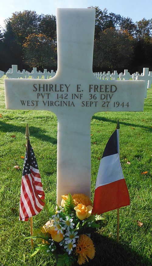 Pvt Shirley E. Freed enlisted in Clarksburg, West Virginia on 19 August 1943.Source of information: André Koch, www.abmc.gov, www.wwiimemorial.com, www.archives.gov – WWII Enlistment Record, www.ancestry.com - 1930/1940 Census / U.S. WWII Draft Cards Young Men, 1940-1947 / Headstone and Interment Record / West Virginia, Births Index, 1804-1938 / 142ndaar-.pdf / https://36th-id.frb.io