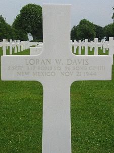 S/Sgt Loran W. Davis graduated from Ranchvale High school and Highland University in Las Vegas, New Mexico. He was an instructor at Utah State Agricultural College.He entered the Air Corps on 11 November 1943 at Clovis, New Mexico. He trained at Shepart Field, Wichita Fall, Texas; Las Vegas, Nevada and Alexandrie, La. and went to England late in August 1944.