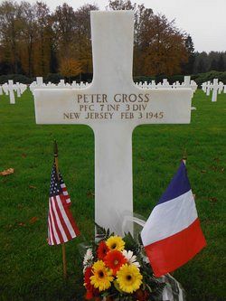 Pfc Peter Gross attended high school for three years and was employed by the Max Rabin Glove Company, before he enlisted in Newark, New Jersey on 12 April 1943.In October 1944, he was wounded in action by small arms fire in France.