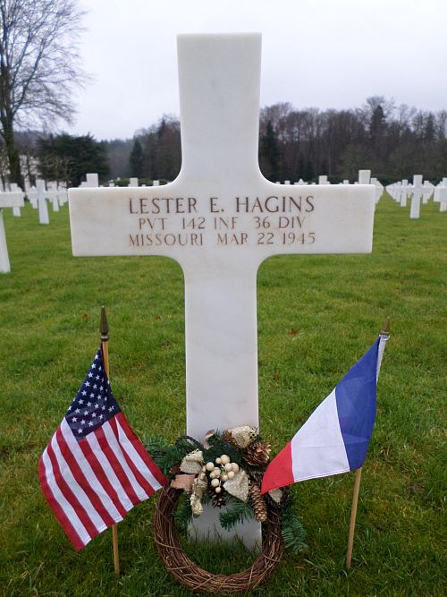 Pvt Lester E. Hagins joined the National Guard at Camp Polk, Missouri on 16 September 1940.He died in a hospital in France of wounds received on 15 March.
