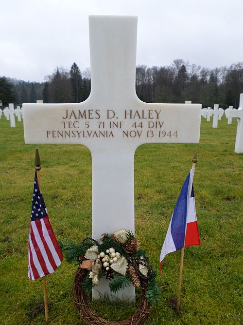 On 13 November 1944, the 44th Infantry Division led the offensive to secure passage through the Vosges Mountains with the 71st Infantry Regiment assigned to seize the city of Sarrebourg, France. It was during this offensive that then Tech 5 James D. Haley suffered mortal wounds from a German artillery barrage on his unit. Records indicated that he was killed instantly.