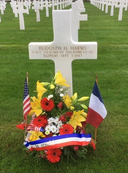 Source of information: Raf Dyckmans, Cynthia (Harms) Anderson, www.wwiimemorial.com, www.archives.gov - WWII Enlistment Record, www.fold3.com - MACR, Robert B. H. Harms family tree book, www.abmc.gov, www.100thbg.com, The Watseka Republican newspaper - 3 February 1944 and 4 May 1944), War Department Report of Death, Iroquois County’s Times-Republic – 9 November 2000