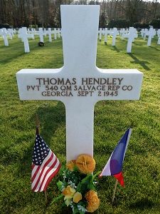 Pvt Thomas Hendley worked on a farm before he enlisted at Fort Benning, Georgia on 18 November 1942.He was first buried at the Temporary American Military Cemetery in Champigneul, France.