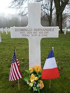 Source of information: André Koch, www.abmc.gov, www.wwiimemorial.com, www.archives.gov – WWII Enlistment Record, www.ancestry.com - 1930/1940 Census, Hernandez Family Tree, Headstone and Interment Records, http://103divwwii.usm.edu/409th-regiment.html - Unit Journal for November 1944, http://103divwwii.usm.edu/assets/mr-409-g-by-name.pdf,