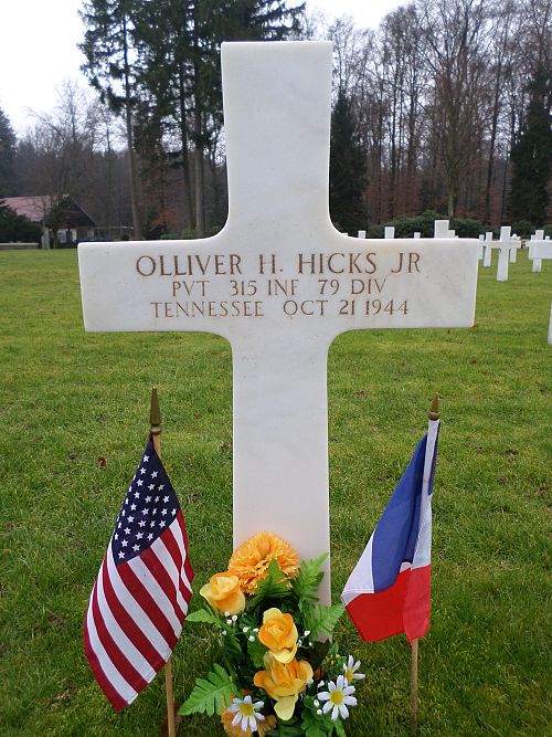 Pvt Olliver H. Hicks Jr. attended high school for three years and was employed at the Grand 5 & 10 Store before he enlisted at Camp Shelby, Mississippi on 22 March 1944.He was killed by small arms fire to his face.