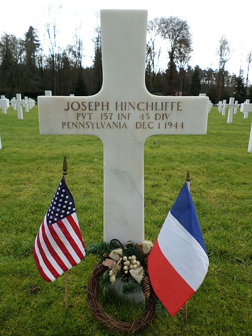 Pvt Joseph Hinchliffe was a welder before he enlisted in New Cumberland, Pennsylvania on 26 April 1944.Source of information: Peter Schouteten, www.abmc.gov, www.wwiimemorial.com, www.archives.gov - WWII Enlistment Record, www.ancestry.com - Headstone and Interment Record / Pennsylvania Veteran Compensation Application Files WWII, http://www.45thdivision.org