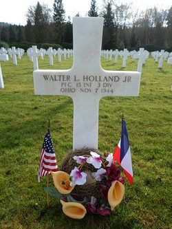 Pfc Walter L. Holland attended college for four years and was employed by the Cam Manufacturing Company before he enlisted in Cincinnati, Ohio on 2 November 1942.In November 1943, in Italy, he was wounded by small arms fire in the abdomen, sine and trunk. He was discharged from the hospital in April 1944.