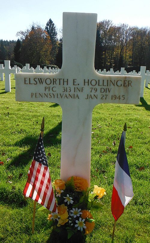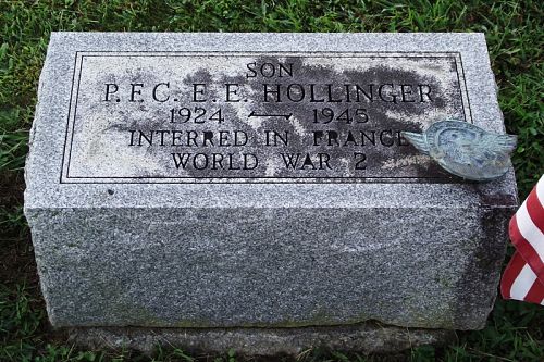 Pfc Elsworth E. Hollinger graduated from Warwick Town Ship High School and was employed by the Animal Trap Company before he volunteered for the Army of the United States in Harrisburg, Pennsylvania on 1 December 1942. He was sent overseas in June 1944.He died of his wounds, received on 17 December 1944.