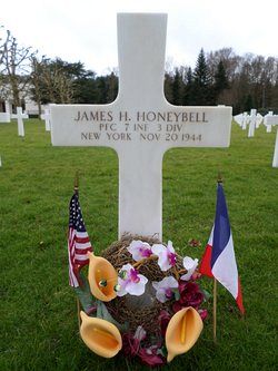 Pfc James H. Honeybell was unemployed before he enlisted in Syracuse, New York on 3 August 1943.From August 1944 to October 1944 he was hopitalized for wounds to his arm and forehead caused by a landmine exlposion.
