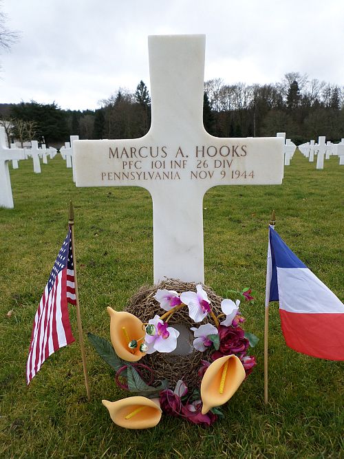 Pfc Marcus A. Hooks enlisted in Pittsburgh, Pennsylvania on 17 February 1943.Source of information: Peter Schouteten, www.abmc.gov, www.wwiimemorial.com, www.archives.gov – WWII Enlistment Record, www.ancestry.com - Headstone and Interment Record / U.S. WWII Draft Cards Young Men / Hooks Family Tree / 1940 Census, After Action Report 26th Infantry