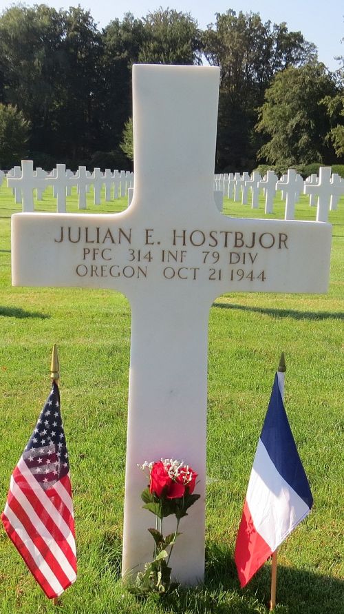 Pfc Julian E. Hostbjor attended college for two years and was employed at the American District Telegraph Company before he enlisted in Portland, Oregon on 2 August 1943.He was killed by artillery shell fragments.
