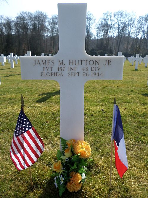 Pvt James M. Hutton attended high school for 2 years before he enlisted in Camp Blanding, Florida, on 30 October 1943.He was first buried at the Temporary American Military Cemetery in Saint-Juan, France.
